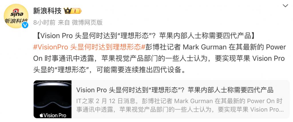 今天,新浪科技的一份報(bào)道中提到:" 蘋果視覺產(chǎn)品部門的一些人士認(rèn)為,要實(shí)現(xiàn)蘋果 Vision Pro 頭顯的‘理想形態(tài)’,可能需要連續(xù)推出四代設(shè)備。"