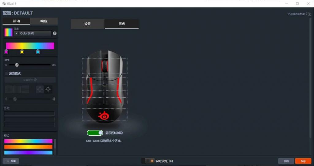 Rival 5 游戲鼠標(biāo)雖然發(fā)光的部分面積并不算大,但是燈效上的可玩性也挺高的。整個鼠標(biāo)發(fā)光的部分被劃分為 10 個 1680 萬色的 RGB 發(fā)光區(qū)域,用戶可以在 SteelSeries GG 驅(qū)動引擎里,對每一個區(qū)域進(jìn)行設(shè)置自己喜歡的燈光顏色和模式,打造個性化燈效。