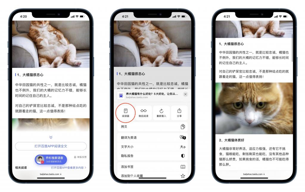 這個功能的開啟方式很簡單,只需在地址欄的更多選項里,點擊「閱讀器」,便可一秒切換,用了就回不去。