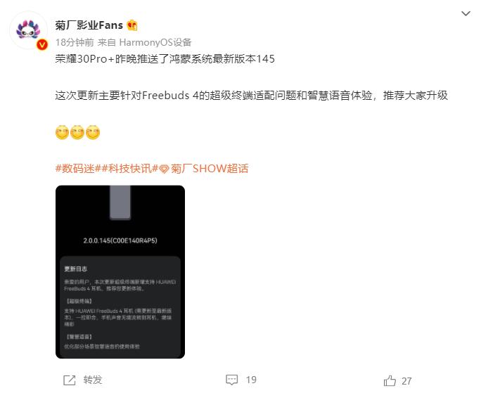 今日上午,微博博主 @菊廠影業 Fans 表示,榮耀 30 Pro + 現已推送 HarmonyOS 2.0.0.145 更新(C00E140R4P5)。
