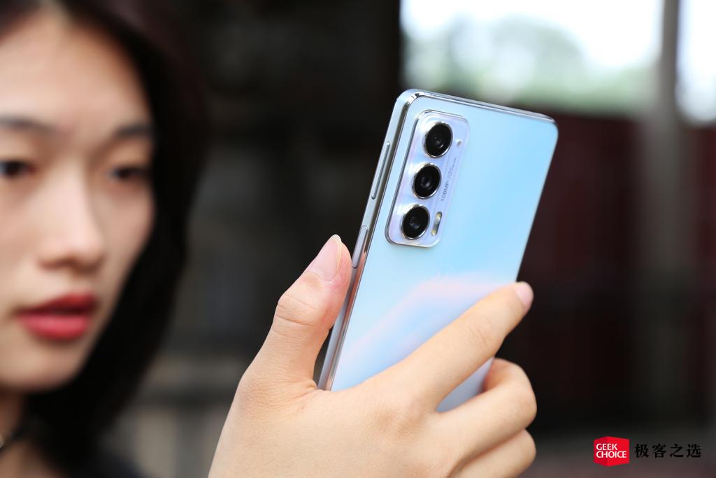 重點來說下后置相機部分。第一眼看上去,摩托羅拉 edge 輕奢版的相機設計風格的確和很多 OPPO 手機有些類似,攝像頭同樣為區隔明顯的縱向排列方式,不過仔細對比下來,其實還是有區別的,鏡頭和底座之間多做了一層階梯結構。