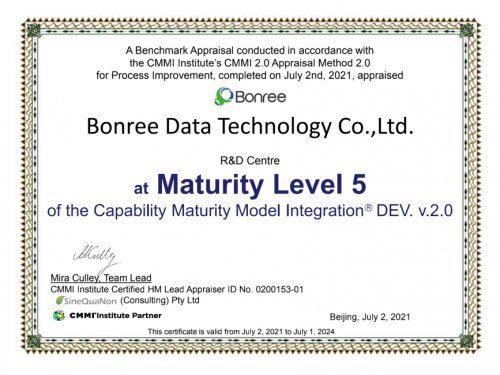 CMMI5的評估認證通過,標志著博睿數據在軟件能力成熟度模型中已達到最高級,在軟件研發水平和管理質量躋身全球軟件業先進水平,與國內外超一流科技企業站在同一起跑線。