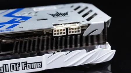 影馳 RTX 3070 Ti HOF PRO 采用雙 8pin 供電,其實 RTX 3070 Ti 雖然用了功耗更高的 GDDR6X 顯存,但 GA104 GPU 本身的功耗并不會高到哪去,所以雙 8pin 供電是完全足夠的,8pin 供電接口也是白色的,配合整卡的風格,在 PCB 背面 8pin 供電接口的下方有兩顆指示 LED,通電后如果沒插 8pin 供電線的話就會亮起警告。