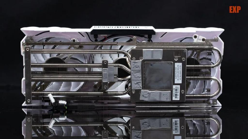 影馳 RTX 3070 Ti HOF PRO 的大天使散熱器采用了大面積的鍍鎳純銅底座,全面覆蓋 GPU 核心和顯存部分,顯存位置對應的部分都有導熱硅膠貼,讓這些發(fā)熱大戶的熱量能及時傳到熱管進而分散到大量的散熱鰭片上,熱管一共有 6 根,均是直徑 6mm 的規(guī)格,并且全部鍍鎳處理,美觀的同時也可以防止日久使用出現(xiàn)氧化,熱管均采用了回流焊接工藝。