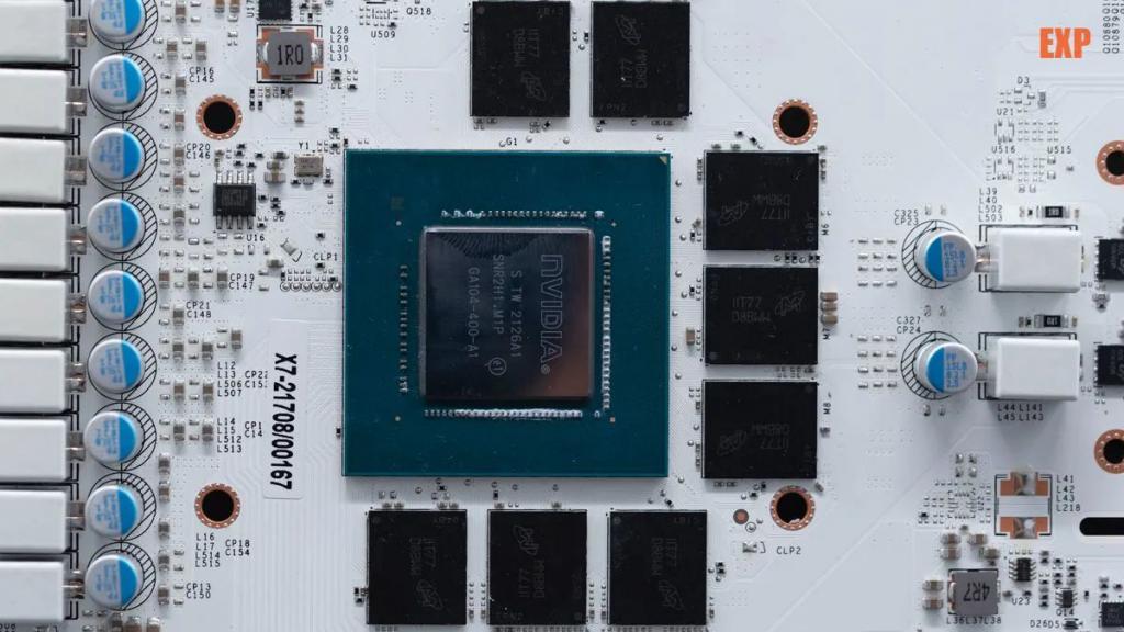 顯卡使用的是 GA104-400 GPU,核心周圍有 8 顆顯存顆粒環(huán)繞,是美光的 GDDR6X 顯存,單顆 1GB 容量,位寬 32bit,8 顆一共組成 8GB 的容量、256bit 位寬,顯存等效數據頻率 19Gbps。