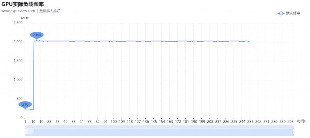 運行 3DMark Time Spy Extreme 測試時 GPU 核顯頻率基本是在 2010~2025MHz 之間跳動,頻率曲線如下圖所示:
