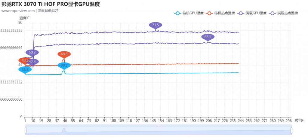 影馳 RTX 3070 Ti HOF PRO 具有風扇待機停轉的功能,所以待機狀態(tài)下全靠被動散熱。經過 5 分鐘的待機測試,從開始的 35.8 攝氏度上升到 38 攝氏度左右,仍然屬于很清涼的范疇,10 分鐘待機過程中最熱點溫度則是最低是開始的 43.5 攝氏度,最高是偏后段的 48.8 攝氏度。