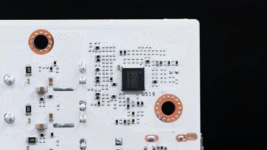 GPU 采用 10 相核心供電,配有獨立的散熱片的,而且這散熱片是直接用螺絲固定在 I/O 擋板上的,也有一定的加固作用。顯卡采用了定制的白色電感,與 PCB 的顏色更配,MosFET 是來美國芯源系統(tǒng)(MPS)的 MP86990-N,是最大輸出 50A 的 DrMOS,GPU 供電 PWM 主控位于 PCB 背部,型號是 MP2888A,正好可以控制 10 相供電。