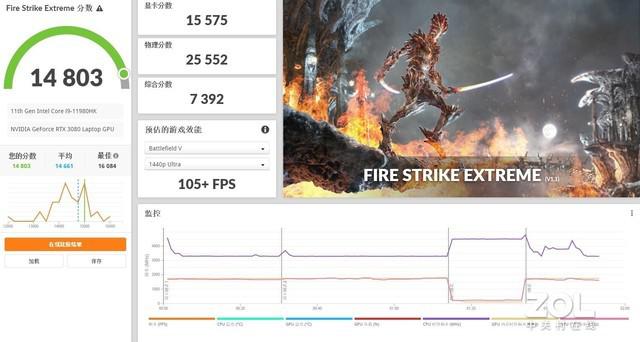 Fire Strike Extreme 模式:15575 分、總分 14803。