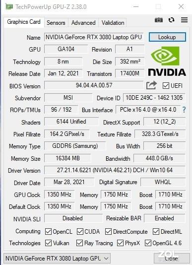 基本參數方面,RTX 3080 獨顯擁有 6144 個 CUDA 核心,總線帶寬 256bit,頻寬 448.0GB/s,擁有 16GB GDDR6 顯存,核心頻率為 1350MHz,顯存頻率為 1750MHz,Boost 頻率為 1710MHz,這樣的規格可以在最高畫質下流暢運行現階段所有游戲,包括光追游戲。