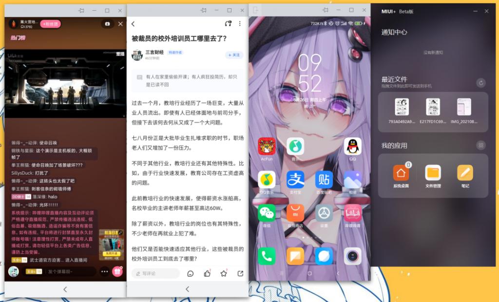 MIUI+ 和華為多屏協(xié)同一樣,都能同時打開三個應(yīng)用窗口,而且應(yīng)用窗口大小也能隨意調(diào)節(jié),但是它們之間依然存在著一定的區(qū)別。在這三個應(yīng)用窗口之外,MIUI+ 還為我們準(zhǔn)備了一個通知中心窗口,可以快速讀取最近文件或者打開常用應(yīng)用。