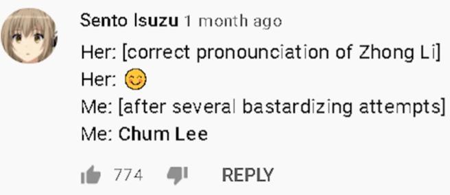 尤其像是「 鐘離 」這個名字,老外很難讀對。在油管上有不少老外都表示為了正確的發(fā)出中文,戴上了 " 痛苦面具 "。