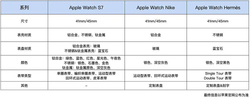 今晚開啟預售的是 Apple Watch S7、Apple Watch Nike、Apple Watch Hermès,具體預售版本如下圖所示: