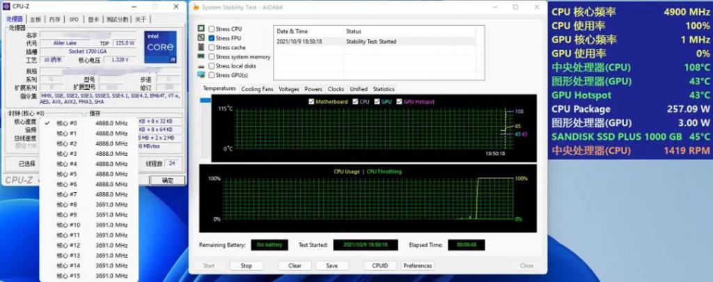 近日,bilibili 用戶 @熱心市民描邊怪使用某處理器(顯然是酷睿 i9-12900K)、B660 主板和 DDR4-3600 內存(Gear 1 模式),在 Windows 11 做了基準測試,用沒扣具的單扇大霜塔散熱,AVX2 功耗 250W,溫度在 108 度左右。博主稱該處理器與 AMD Ryzen 9 5950X 相比,單線程性能完全壓制,多線程性能相當。在 10nm Enhanced SuperFin 工藝下,溫度表現明顯好于酷睿 i9-11900K 處理器。
