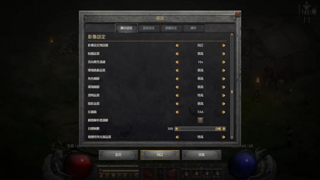 此外《暗黑破壞神 2:獄火重生》雖然提供有多個預設畫質(zhì),但預設的最高畫質(zhì)并不是所有畫質(zhì)選項設為最高,有部分項目還是需要手動選擇最高檔的。因此在我們的測試中,我們都是手動把全部畫質(zhì)選項都設定到最高檔次后,在全屏模式下進行體驗的。