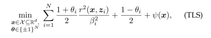 但話說回來,「可認(rèn)證算法」所扮演的角色雖然聽起來很簡單,研究起來卻并不容易,因?yàn)樵谶@個(gè)研究的過程中涉及到了對截?cái)嘧钚《朔ǎ═runcated Least Squares, TLS)的求解。TLS 是一個(gè)非凸優(yōu)化問題,其可行域集合可能存在局部最優(yōu)點(diǎn),但求解全局最優(yōu)的難度相當(dāng)于 NP 難題。