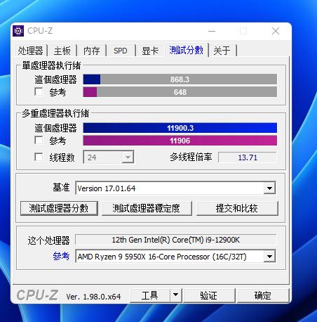 CPU-Z 跑分單核 868,多核 11900,單核提升 11%,多核提升 6%。