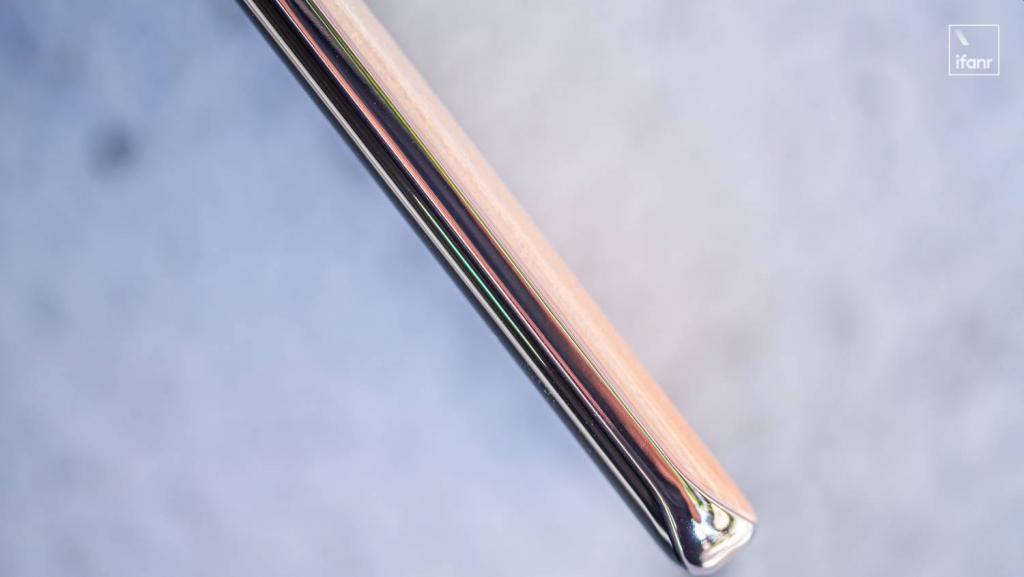 此次,我體驗的是「朱麗葉」配色,在沒有光線之下,機(jī)身上半部為白色,下半部為橙紅,配合金色的鏡頭模組,有些典雅。當(dāng)有光線之時,背部會有淡藍(lán)色光柱與金色閃光,配合鉆彩,整機(jī)從典雅轉(zhuǎn)向華麗。
