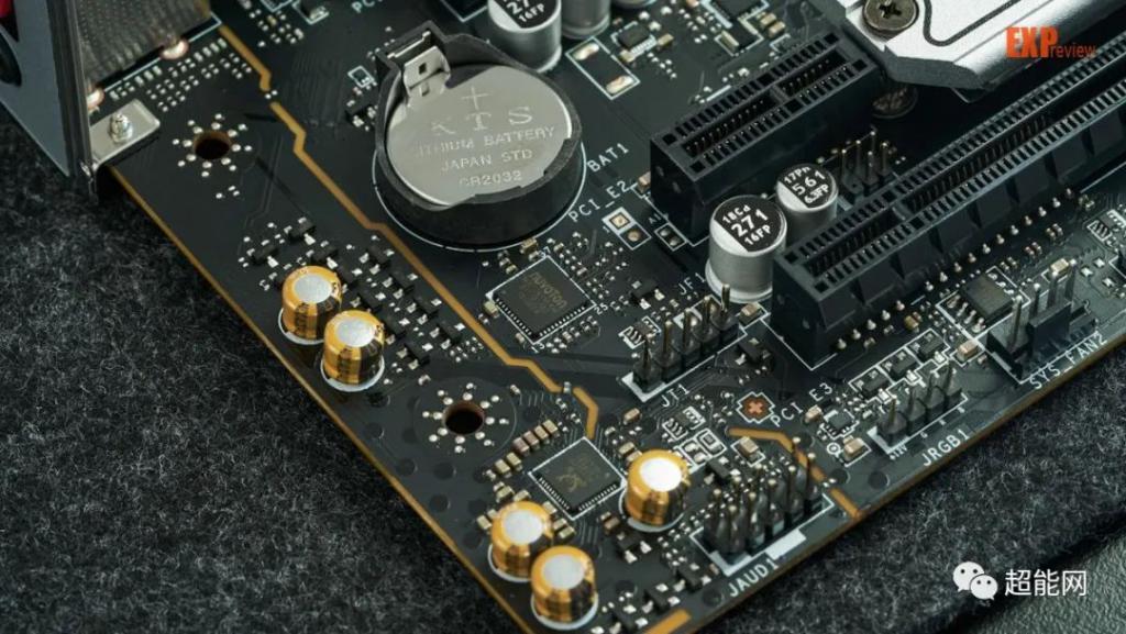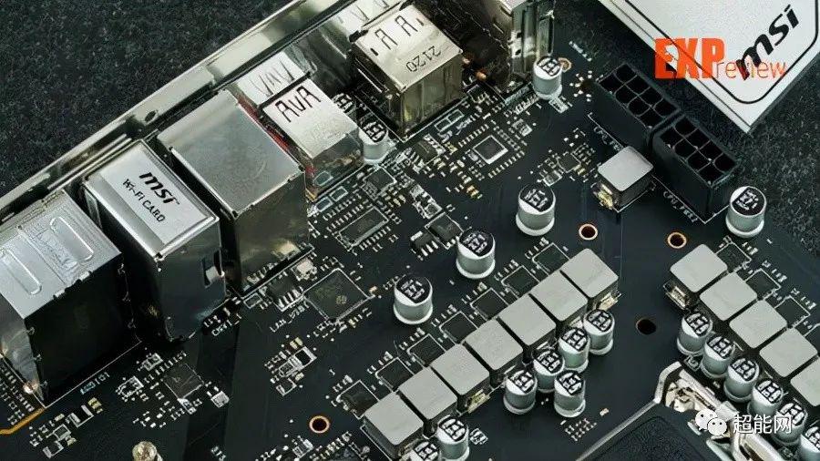 VRM 供電部分配了兩塊體積較大的散熱器,特別是靠 I/O 擋板那側(cè)的那塊,直接充當(dāng)了 I/O 護(hù)甲,這些散熱器除了可以幫 MOS 散熱外還照顧到了供電電感,加了散熱片后可以有效降低 VRM 供電部件的工作溫度,讓它們可以更穩(wěn)定的為 CPU 提供電力。