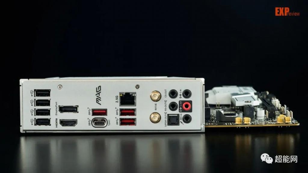 主板配備一體式 I/O 背板,這背板和旁邊的 I/O 散熱器一樣是白色的,這里有一個(gè) USB 3.2 Gen2*2 Type-C 口,三個(gè) USB 3.2 Gen 2,四個(gè) USB 2.0,視頻接口包括一個(gè) HDMI 2.1 和一個(gè) DipsplayPort 1.4,均支持 4K @60Hz 的視頻輸出,5 個(gè) 3.5mm 音頻接口和一個(gè)數(shù)字 S/PDIF 輸出。