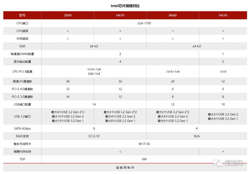 Intel 600 系主板芯片組規(guī)格如上表所示,H670 的規(guī)格還是比較接近 Z690 的,但由于其不上不下的定位基本上在零售市場(chǎng)上會(huì)比較少見(jiàn),大家比較關(guān)心的肯定還是主流的 B660 的規(guī)格。與 Z690 相比,B660 的 DMI 通道帶寬從 x8 減少到 x4,不過(guò)帶寬其實(shí)與上代的 Z590 持平,帶寬上的瓶頸比還是較少的。