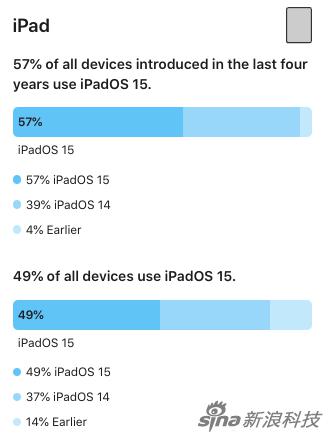 另外,細分設備的話,iPadOS 的采用率更低:過去四年推出的 iPad 中有 57% 運行 iPadOS 15,39% 運行 iPadOS 14,4% 運行更舊的系統;全部 iPad 設備對應的數字則是 49% ,37% 和 14%。
