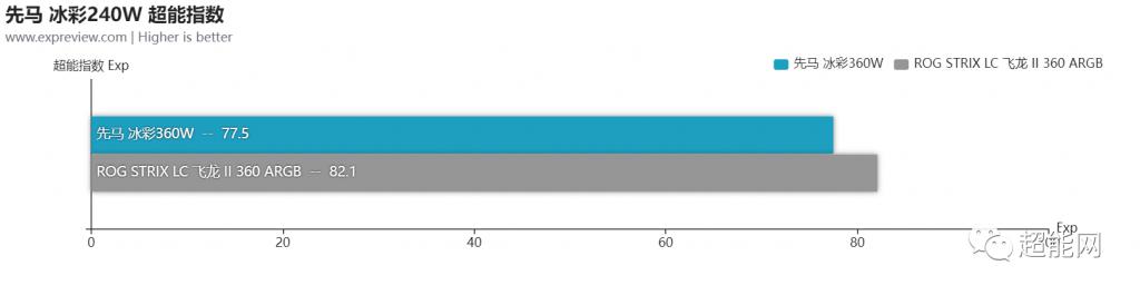 在此需要說明一點,目前我們超能網的測試平臺已針對英特爾新一代 LGA 1700 平臺做了針對性的調整。對于想搭配英特爾第 12 代酷睿系列處理器使用的用戶,也有一定的參考價值。根據測試的數據,轉換為超能指數后,ROG STRIX LC II 360 ARGB 吹雪版分數為 82.3,屬于非常出色的水平了。