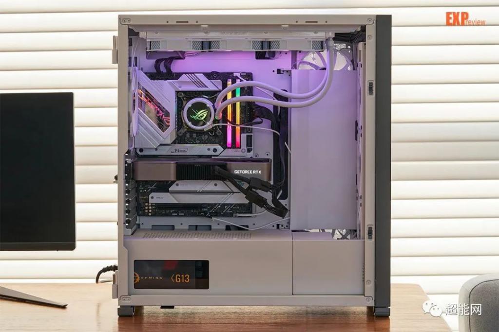 在安裝完成后,整體顏值真的很高,整體白色的外觀設計,配合白色的機箱帶來了純潔美。對于顏值黨來說,還是很建議搭配一套白色系硬件組建全家桶,在亮機后無論是 ARGB 散熱風扇,還是水冷頭,燈光效果都很絢麗耀眼,如雪中精靈般靈動,放到家里絕對是顏值擔當了。