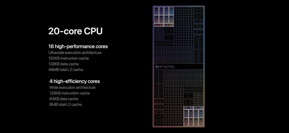 該芯片的各項硬件指標也翻番:20 核 CPU 包含 16 個高性能核心、4 個高能效核心;GPU 核心數量增至 64 核;32 核神經網絡引擎能夠帶來每秒 22 萬億次的運算能力;統一內存最高規格達到 128GB;內存帶寬提升至 800GB/s,達到最新型號臺式 PC 芯片的 10 倍以上。同時,M1 Ultra 最高支持 8TB 的 SSD 固態硬盤存儲。