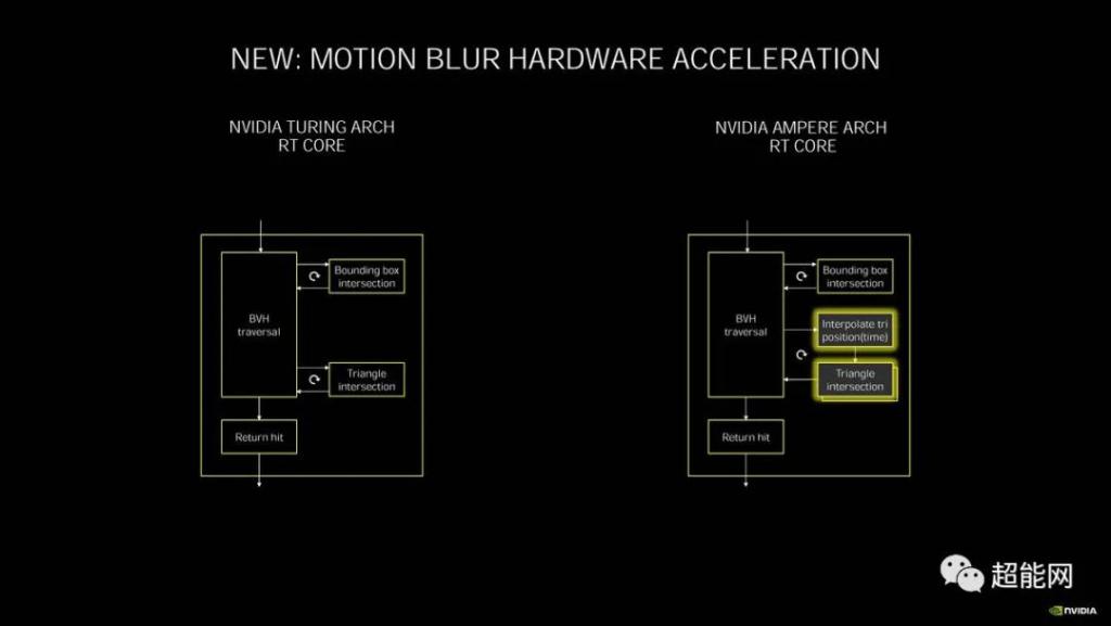 NVIDIA在其中新加入的插值算法可以在保證動態(tài)模糊精確性的同時提高了實時光線追蹤效率,官方表示最高可達8倍于上代的速度。另外在基礎的BVH計算上,第二代RT Core也可以比第一代快2倍。