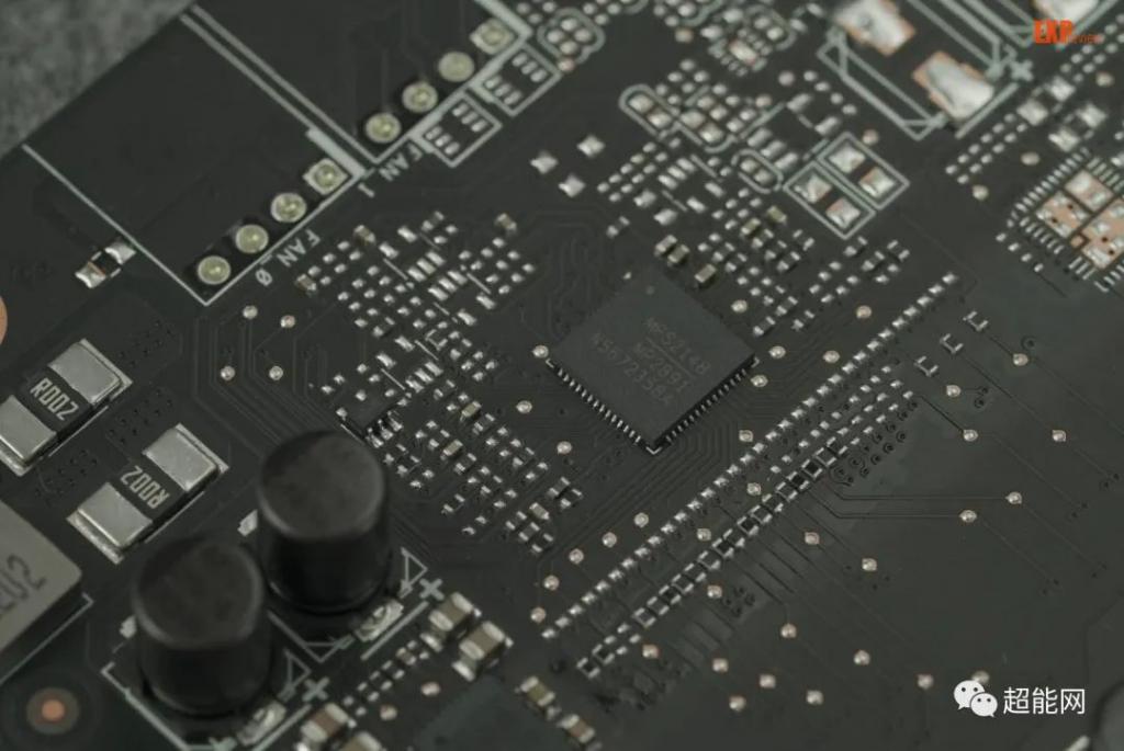 PCB上除了GPU和顯存外,剩余空間基本上都用于布置供電元件,GPU的左右兩側(cè)都有供電電路,一共是21相,其中18相給GPU核心供電,3相為顯存供電。供電部分的mosFET均是芯源系統(tǒng)(MPS) 的MP86957,供電控制方面主要是1顆芯源系統(tǒng)(MPS) 的MP2891來負責。