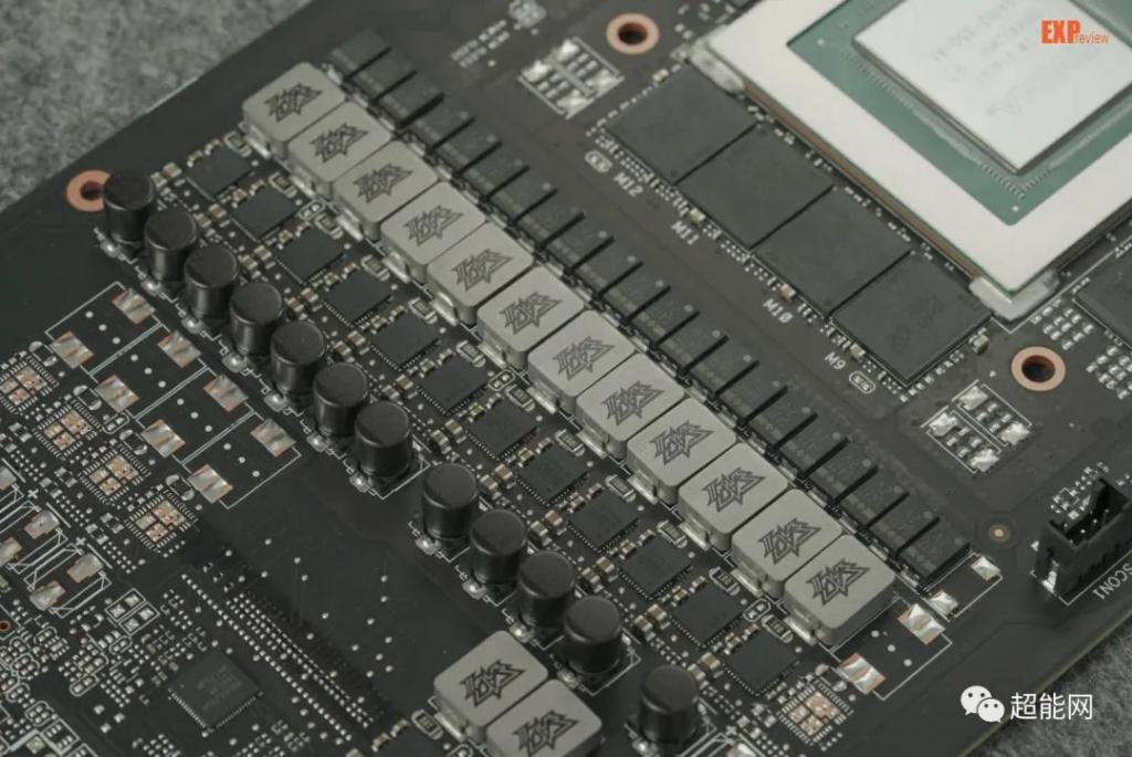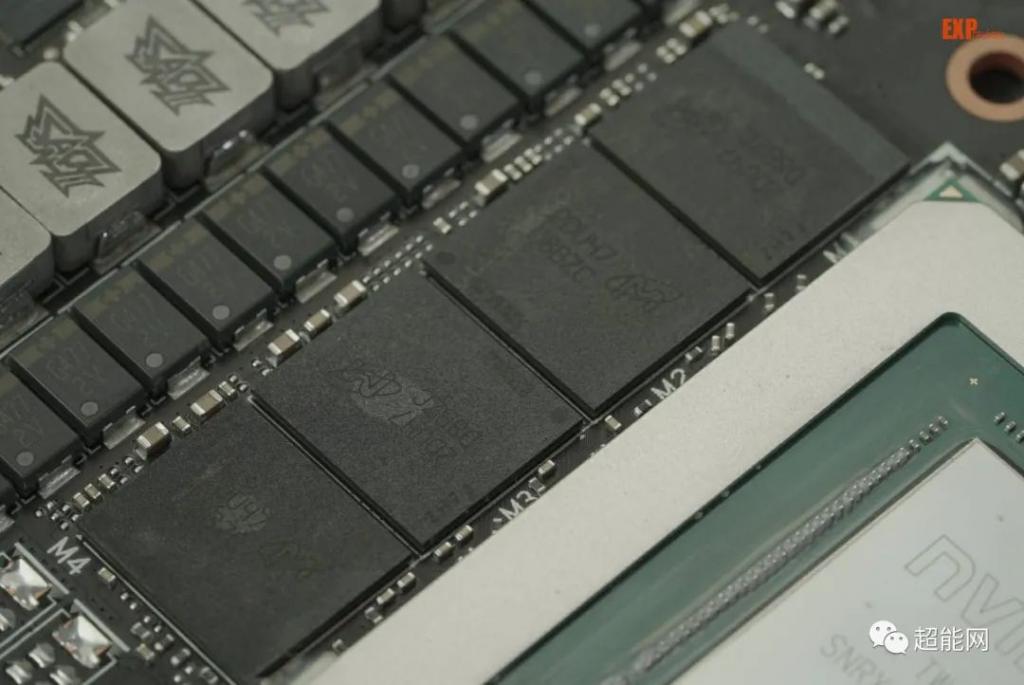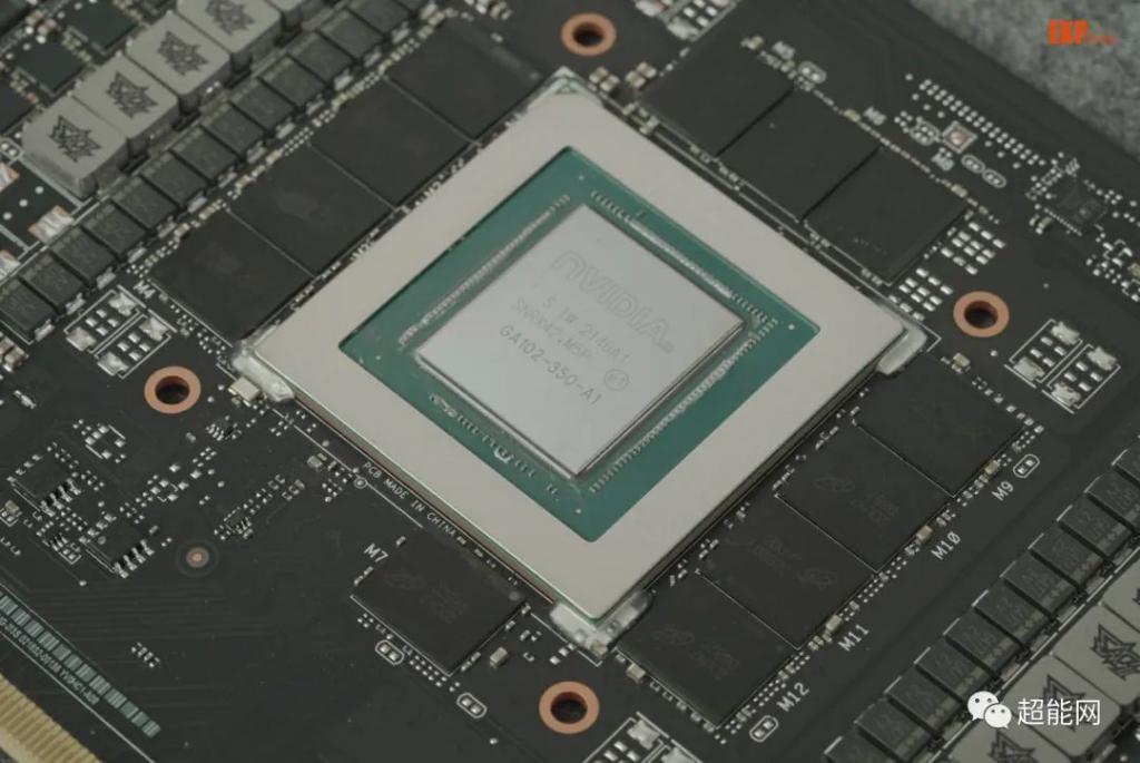 周圍有12顆美光的GDDR6X顯存,型號為美光的D8BZC,單顆2GB容量,32-bit位寬,12顆一共組成24GB 384-bit的顯存規(guī)格。