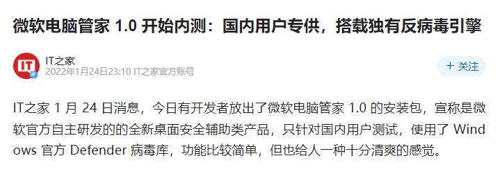 最近微軟出了款中國特供電腦管家的消息,在網上收獲了很多網友的好評,稱贊微軟這波操作實在是太接地氣了。