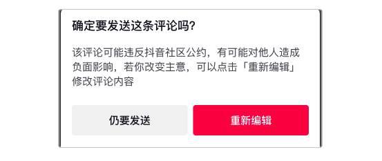 和微博為用戶構建防護墻不同,抖音還會主動出擊,向那些內容發布者示警。用戶在評論區發布的違規 / 低質評論會被模型匹配校驗,收到評論彈窗「該評論可能對他人造成負面影響」,引導用戶重新編輯。若用戶選擇繼續發布,則評論也會不公開可見,進入審核環節內合規才能放出。