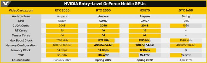 據悉,GeForce MX570 和 RTX 2050 有許多相似之處。兩款 GPU 都基于 Ampere GA107 GPU,擁有 2048 個 CUDA 核心、16 個 RT 光追 / 64 個 Tensor 張量單元。