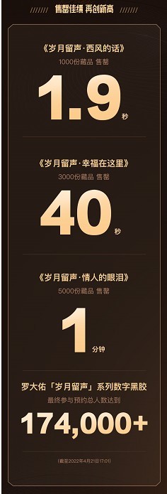 4月21日,“音樂教父”羅大佑攜手TME數(shù)字藏品推出的「歲月留聲」系列數(shù)字黑膠壓軸之作《歲月留聲·西風(fēng)的話》正式登陸QQ音樂,引發(fā)搶購熱潮。截至目前,「歲月留聲」三張數(shù)字黑膠累計(jì)預(yù)約人數(shù)超17.4萬+;從樂迷熱烈的追捧中不難發(fā)現(xiàn),系列數(shù)字黑膠不僅擁有極高的藝術(shù)價(jià)值,還以數(shù)字藏品形式充分挖掘了羅大佑音樂作品的收藏價(jià)值,讓樂迷擁有了獨(dú)一無二的收藏體驗(yàn)。