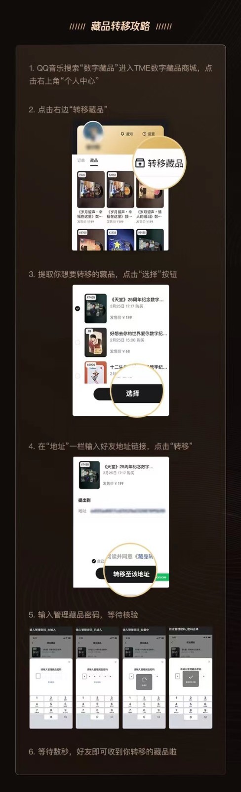 珍藏因分享而更具意義,為加強(qiáng)用戶間的聯(lián)系,TME數(shù)字藏品于近日上線了平臺(tái)轉(zhuǎn)移功能。用戶在擁有一數(shù)字藏品365天后,即可在平臺(tái)內(nèi)向好友贈(zèng)送自己的珍藏,通過數(shù)字藏品與友人在此相“鏈”。