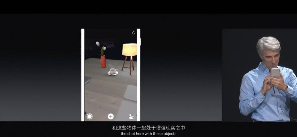 在當年的 WWDC 上,蘋果軟件工程高級副總裁克雷格 · 費德里吉(Craig Federighi)手握一臺 iPhone 7,在他面前的桌子上放了一杯咖啡、一盞燈,以及一個花瓶。當然,它們都是虛擬的。