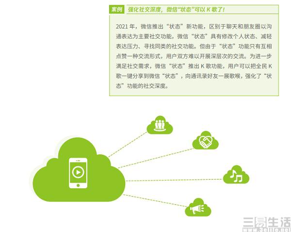 其實對于微信而言,其對于去年上線的 " 狀態(tài) " 或許寄予了厚望。近日在騰訊方面發(fā)布的《騰訊可持續(xù)社會價值報告 [ 2021 ] 》中,就將 " 狀態(tài) " 描述為 " 區(qū)別于聊天和朋友圈,具有修改個人狀態(tài)、減輕表達壓力、尋找同類的社交功能 "。為了進一步滿足用戶的社交需求," 狀態(tài) " 中也推出了 K 歌功能、聽歌功能。而此次與網(wǎng)易云音樂的聯(lián)動,就像此前火上熱搜的 " 微信農(nóng)場 " 一樣,更多的或是出于官方宣傳相關(guān)功能的目的。