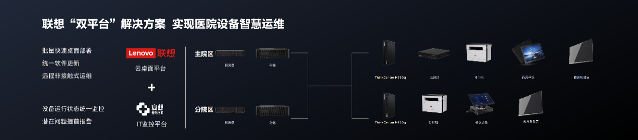 在醫療行業,聯想整合出“云桌面平臺”和“IT監控平臺”雙平臺智慧運維解決方案。云桌面平臺,通過桌面批量部署、遠程維護技術,實現醫院桌面終端的極速部署和更新,極大的提升了運維效率;IT監控平臺,則統一監控管理醫院的全線IT設備的運行狀態,潛在問題提前預警,將隱患扼殺在搖籃中。“雙平臺”軟件實現了醫院多院區之間,前后端IT基礎設施硬件的互聯互通,提升了運維工作效率,開啟了醫院設備智慧運維新時代。