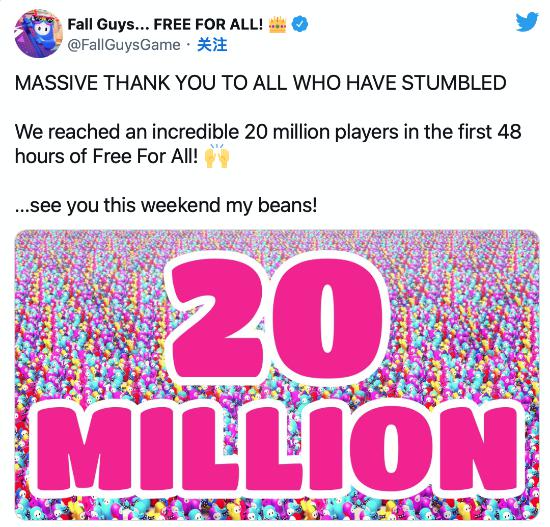 今日,《糖豆人:終極淘汰賽》官方宣布,在游戲全平臺免費兩周后,玩家數突破 5000 萬。此前官方曾于 6 月 26 日宣布,游戲免費后 48 小時內,玩家數就達到了 2000 萬。