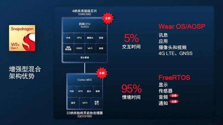 不僅如此,第一代驍龍 W5+ 的這顆協處理器甚至還擁有一套自己獨立的 RTOS 實時操作系統。這就意味著哪怕主 SoC 處于完全休眠狀態,第一代驍龍 W5+ 也可以僅靠協處理器實現持續健康監測、保持表盤的完整顯示,甚至是只用協處理器來應對日常高達 80% 以上使用時段的功能需求,從而大幅降低了未來智能手表的日常功耗水平。