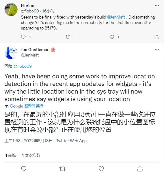 這一疑問得到了 Windows 工程團隊的 Jen Gentleman 的肯定回復,他表示,微軟最近一直在做改進小部件位置檢測的工作,這也是小位置圖標有時候會說小部件正在使用您的位置的原因。