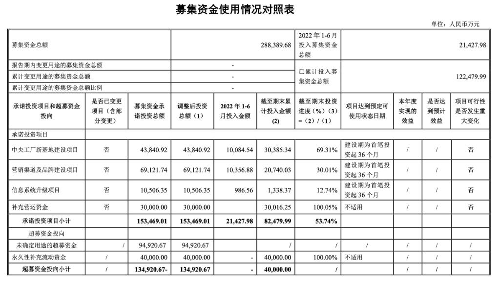 在上市后,貝泰妮共募集資金凈額 28.84 億元。其中用于 " 中央工廠新基地建設項目 " 投資總額為 4.38 億元,截至 6 月 30 日,投資進度已完成 69.31%。
