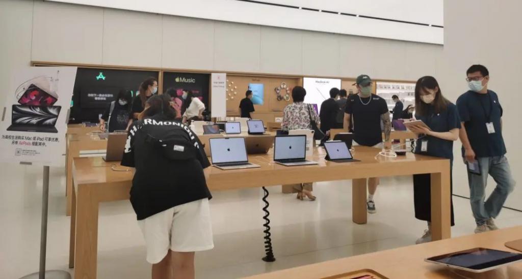 9 月 6 日下午 15 時,燃次元在北京市朝陽區 Apple 零售店(朝陽大悅城店)停留了大概 20 分鐘,這 20 分鐘里,手機區僅偶有一兩位客人到訪,而電腦和平板區則聚集著較多顧客。