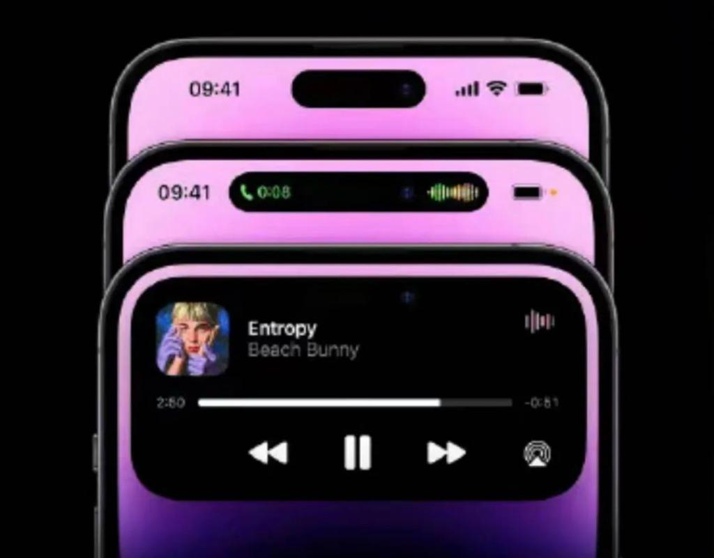 新增的 "Dynamic island (靈動島)" 功能,即將前置鏡頭的挖槽位置,增加新的交互方式,在前置鏡頭部分展示通知、音樂播放、通話等信息。