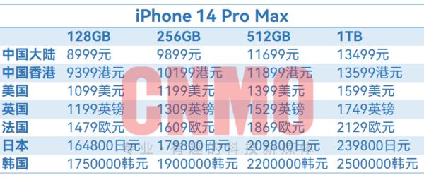 iPhone 14 Pro Max 同樣有 128GB、256GB、512GB 以及 1TB 四種版本,售價分別為 8999 元、9899 元、11699 元以及 13499 元。