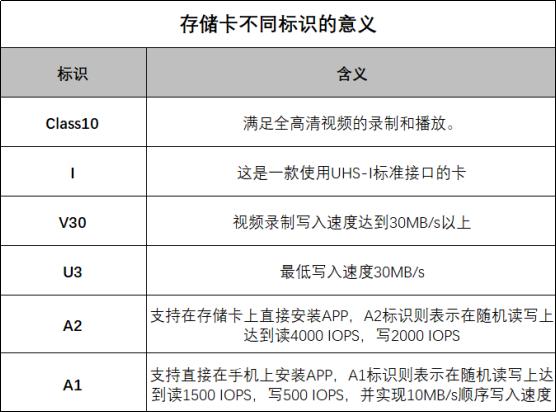 另外,隨著手機 APP 越來越多,支持將 APP 直接安裝到存儲卡里的技術也出現了。為了量化存儲卡在運行 APP 時的性能水平,在 SD 5.1 版里加入了 App Performance 等級標準和標志,其中的 App Performance Class 1 就是 A1 標準,符合 A1 標準的存儲卡性能需要達到 1500 IOPS 隨機讀取、500 IOPS 隨機寫入、10MB/s 順序寫入的水平。后來還推出了速度更快的 A2 標準(隨機讀取 4000 IOPS,隨機寫入 2000 IOPS),以滿足用戶使用手機時越來越快的數據處理需求。