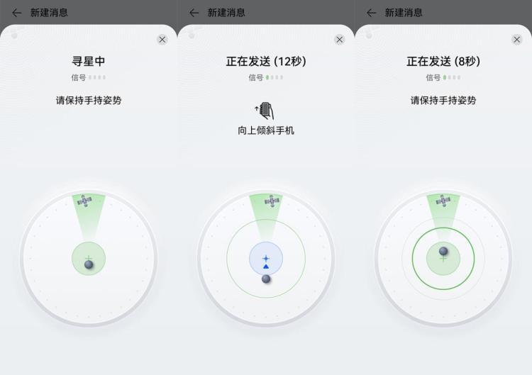 全部操作都是在暢連 APP 中完成,進入到 " 北斗衛星消息 " 界面后,輸入好求助內容、選擇好聯系人后,在點擊發送按鍵后需要用戶移動到空曠位置按照屏幕提醒移動,在搜索到衛星后,等待十幾秒就能發送出去緊急信息,流程還是比較簡潔的。