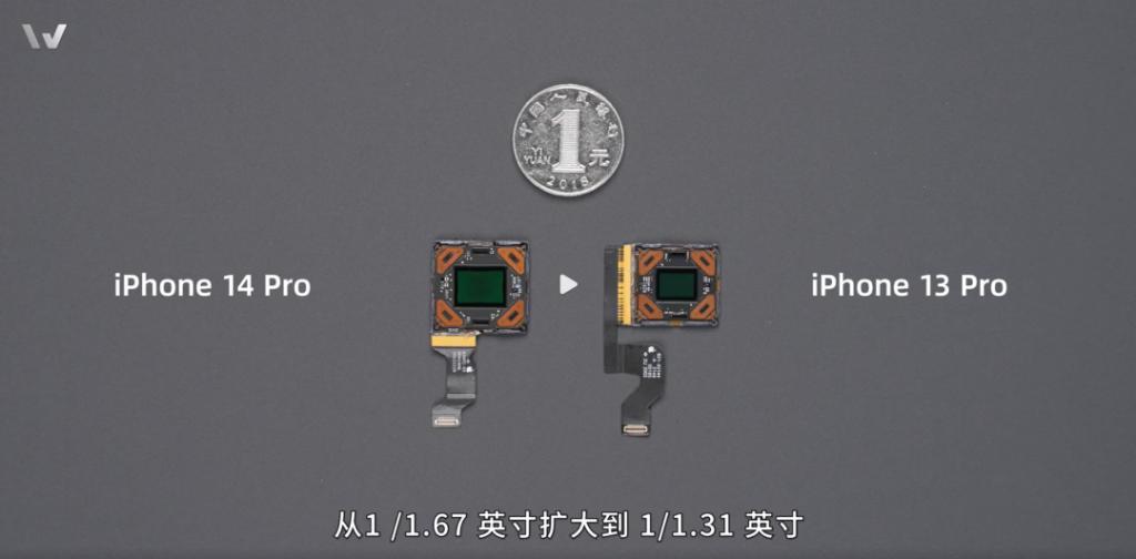 iPhone 14 Pro 首次將攝像頭提高到了 4800 萬像素,傳感器從上代的 1/1.67 英寸升級為 1/1.31 英寸,變大的傳感器自然會帶動后置攝像頭體積的變化。從樓斌 Robin 的 iPhone 14 Pro 拆機視頻中,就能直觀看到 iPhone 14 Pro 的后置攝像頭模組和傳感器都明顯大于上代。